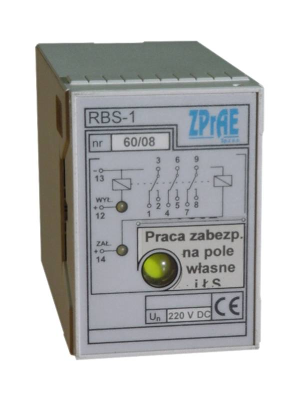 The bistable relay RBS-1 are meant for multiplying and memorising signals (in case of voltage loss) in the electro-energetic automation circuits. The relay has two controlling inputs: turning ON (ZAŁ) and OFF (WYŁ) with diodes indicating application of steering voltage, two input relays and the bistable element with three switch-over contacts. The RBS versions of the relay are additionally equipped with optical indicator of operation.