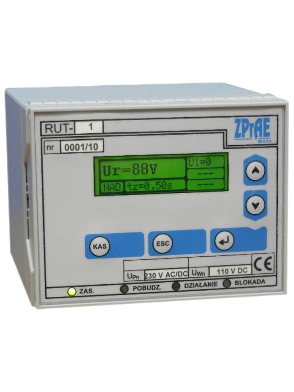 The RUT - type relay has isolated measuring inputs. RUT-3 monitors up to three independent values of effective sinusoidal voltage 50Hz, RUT-1 monitors one DC voltage. Voltage level detector checks extreme values of effective voltage measured, and the steering system executes programmed functions basing on information from the detector, and state of the input blockade. The relay has one instantaneous changeover contact of the activation relay (PP), two time-delayed changeover contacts of the operating relay (PW), one make contact of the relay signalling activation of a blockade (PB). In case of detection of excess voltage on any input the PP relay is energised, what is signalled with permanent light of the “Pobudzenie” diode. At the same time effective values of monitored voltages (input voltages) are displayed. At the moment of operation they are saved, and displayed cyclically until reset with a pushbutton.