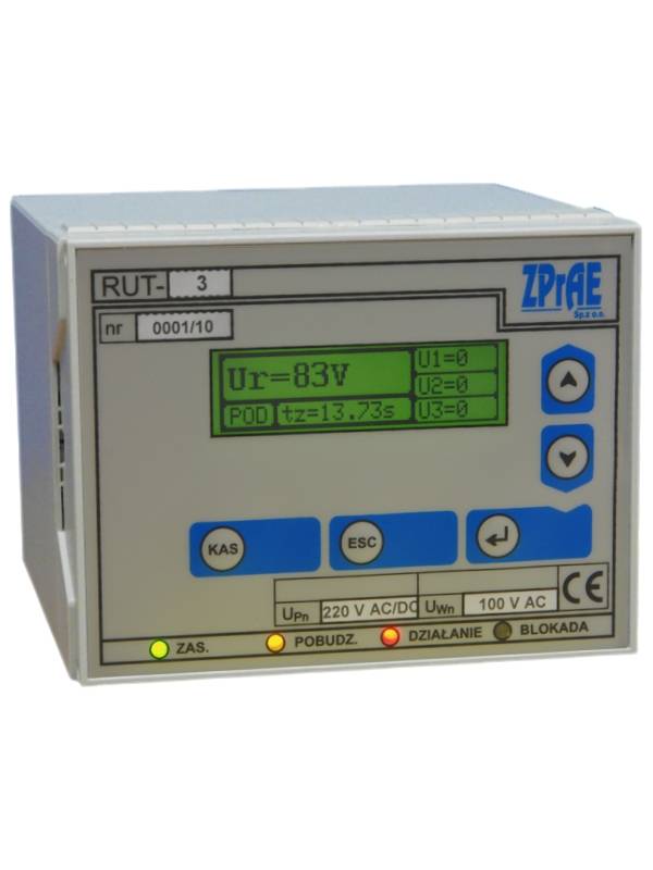 The RUT - type relay has isolated measuring inputs. RUT-3 monitors up to three independent values of effective sinusoidal voltage 50Hz, RUT-1 monitors one DC voltage. Voltage level detector checks extreme values of effective voltage measured, and the steering system executes programmed functions basing on information from the detector, and state of the input blockade. The relay has one instantaneous changeover contact of the activation relay (PP), two time-delayed changeover contacts of the operating relay (PW), one make contact of the relay signalling activation of a blockade (PB). In case of detection of excess voltage on any input the PP relay is energised, what is signalled with permanent light of the “Pobudzenie” diode. At the same time effective values of monitored voltages (input voltages) are displayed. At the moment of operation they are saved, and displayed cyclically until reset with a pushbutton.