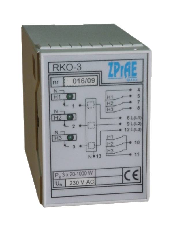 The RKO-3 relay is meant for use in power supply circuits of heaters located in cable cases and cabinets with automation. The relay may also be used in circuits of other devices, where control over power supply continuity is required. The RKO-3 relay is intended to check current flow through three supplying circuits. This can be a 3-phase circuit or three single-phase circuits. In case of loss of current flow signalling contacts of a set phase are made.