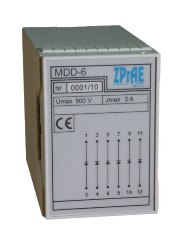 The MDD-6 diode blocks are meant for use in steering signalling and protection circuits. They enable diode separation in the steering and signalling circuits. They are most commonly used in circuits of probe lamps or to create bulk control signal. The diodes used in the diode blocks has parameters sufficient to be used in 220 V DC installations. The MDD-6 block has 6 independent diodes.