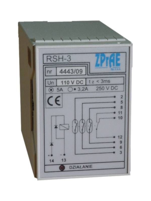 The RSH-3 relay is a very fast (t ≤ 3ms) interposing relay intended mainly for controlling the power breaker coil. The relay has a high switching capacity and therefore it can frequently interrupt current in the power breaker coil operating in a 220V DC circuit. For instance number of operations for current of 3,2 A exceeds 5 000 times, and for current of 1,2 A exceeds 25 000 times. The RSH-3 relay is suitable to control typical power breakers used in 110 ÷ 400 kV substations.
